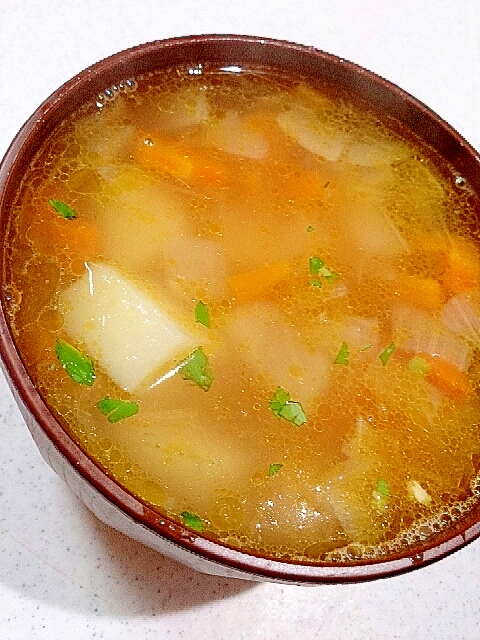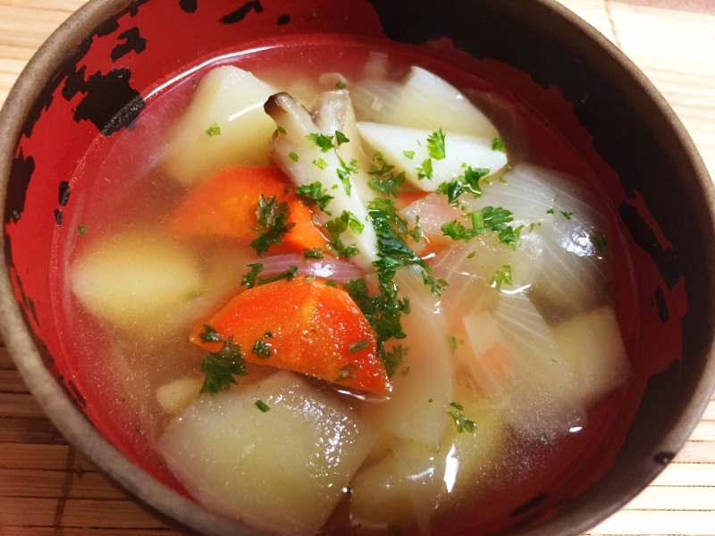 にんじんとじゃがいもの具沢山コンソメスープ 作り方 レシピ クラシル